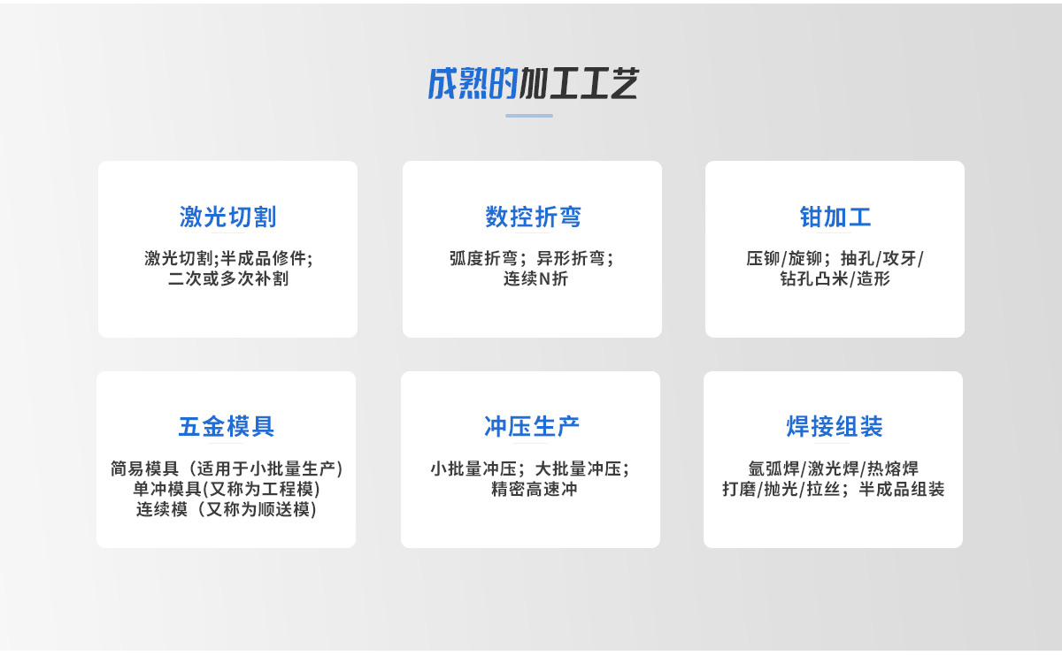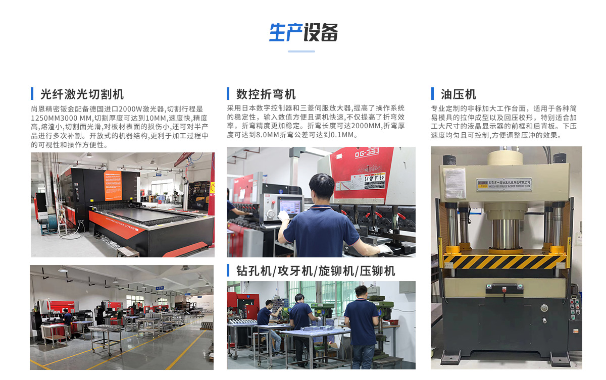 尚恩精密鈑金引進型的光纖激光切割機,數控折彎機,壓鉚機,旋鉚機,焊接機,定制超大工作臺面的油壓機等生產設備,切割精度可達±0.03mm,折彎精度可達±0.10mm,快可以1天交貨,正常發貨3-7天。